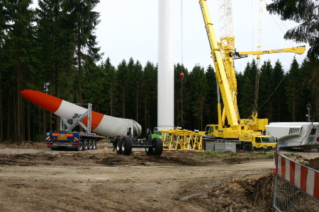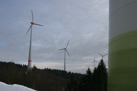 Am 19. März 08 wurde in Hilchenbach die fünfte neue Windenergieanlage in Betrieb genommen. Damit ist der Windpark fertig und die Anlagen erzeugen, bei Windgeschwindigkeiten um 12 m/sek, eine Leistung von je 2MW (MegaWatt). So manche Glühbirne wird also ab sofort mit Windstrom aus Hilchenbach leuchten. (Legt man eine 40 Watt Birne zu Grunde, so sind das (bei fünf mal 2MW) 250 000 Glühbirnen, verwendet man Stromsparlampen a 11W, so sind es fast 910 000 Stck.!!) Die Rotorblattspitzen erreichen, senkrecht stehend, eine Höhe von 179 m. Der Kölner Dom hat eine Höhe von 157m.