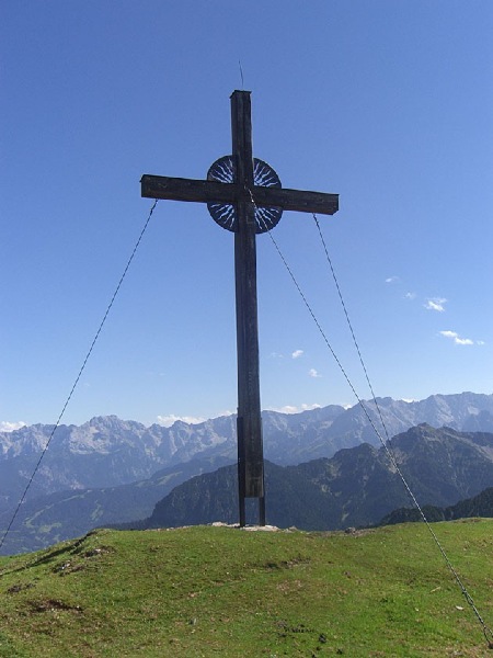 Das Gipfelkreuz - , verwittertes Holz, durch starke Drahtseile gesichert, steht es, unverrückbar, seit vielen, vielen Jahren hier oben und trotzt Wind und Wetter. Nicht viel Platz ist hier. Ganz alleine sitze ich und bin überglücklich, eine Weile sprachlos, ob der Schönheit der Natur und kaum in der Lage einen Gedanken zu fassen. Ich packe meinen Rucksack aus und labe mich an trockenem Brot, Käse, ein Apfel. Delikatessen hier oben und als Krönung, gegen den Durst, Bier, in einer Plastikflasche, -welch eine Sünde, aber natürlich alkoholfrei.