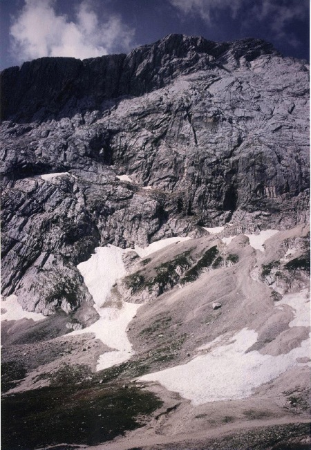 Mein Blick richtet sich nach oben. Die Augen zu schmalen Schlitzen geschlossen, sehe ich oben die nackte Felslandschaft, mit Latschenkiefern und weißen Altschneetupfen malerisch dekoriert. Mein Fernglas, griffbereit, zeigt mir ganz oben im Kar, ein paar dunkle Punkte, die sich bewegen. Bevor ich scharf gestellt habe, weiß ich, dass es Gämsen sind. Dahin möchte hinauf und eine unbändige Freude kommt über mich.Das Wetter ist ideal und der Wetterbericht hatte nur ganz vereinzelt Wärmegewitter angekündigt. Seit längerer Zeit bin ich nun wieder in meinem gleichmäßigen,wiegenden Schritt unterwegs und der Blick ist immer auf den Weg gerichtet. Es ist steil geworden. Felsstufen, die ich hinaufklettern muss, wechseln mit immer kürzeren Pfadstücken. Immer wieder muss ich den Weg suchen, diesen Steig kennen nur die Einheimischen und er ist in keiner Karte verzeichnet. Ein Freund aus dem Dorf hat ihn mir beschrieben und ich bin ganz alleine unterwegs. Meine Gedanken sind schon weit oben, sehen schon das Gipfelkreuz, aber als ich aufschaue sehe ich nur die endlose Felswand vor mir. Am Horizont liegen Wolken wie eine Barriere, aber sie sind so weit. An manchen Stellen sehe ich einen schwachen roten Fleck, gerade noch erkennbar sind die alten Markierungen und ich weiß, dass ich auf dem Wege bin.Hinter einer Felsnase sehe ich, weit oben sind Stück einer Drahtseil Sicherung zu erkennen. Da, da oben ist der Weg. Ich freue mich auf diese Stelle und zielstrebig steige ich schneller hinauf. Eine Weile; wo ist der Weg? Steine, Geröll, aber der Weg…? Die Richtung zum Drahtseil weiß ich und nach weiteren, vielen Schritten bin ich so nah. Ein paar Stufen, über ein kleines Geröllfeld, dann kann ich das rostige, aufgespleißte Drahtseil ergreifen. Ziehe mich hinauf zu einem kleinen Plateau, kaum einen halben Quadratmeter groß. Aber ich stehe sicher und sehe mich um. Die Wolken...!